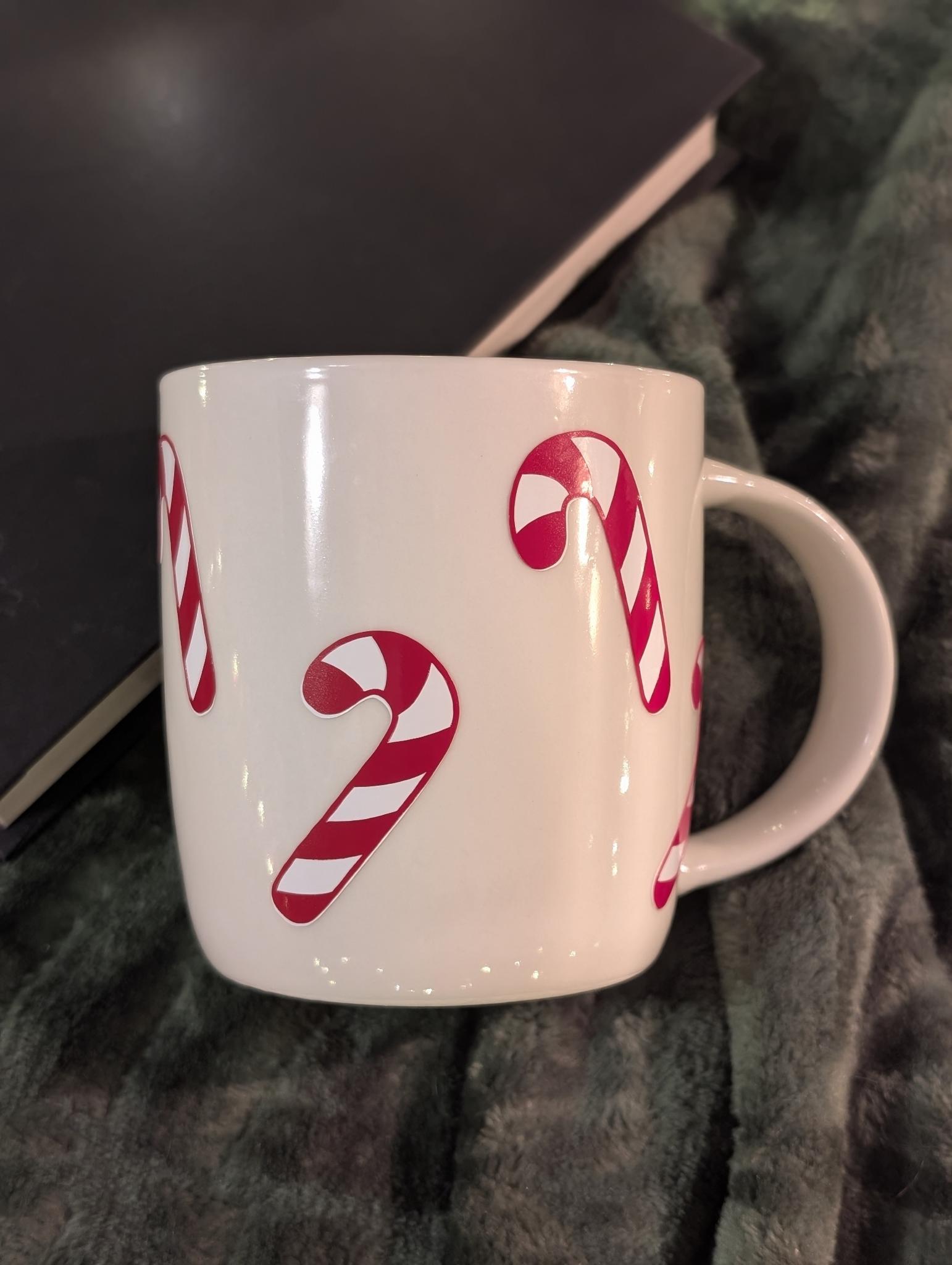 This vinyl-decorated mug features glossy red-and-white candy canes wrapped all around the cup — a simple, festive design that makes every sip feel a little more magical.