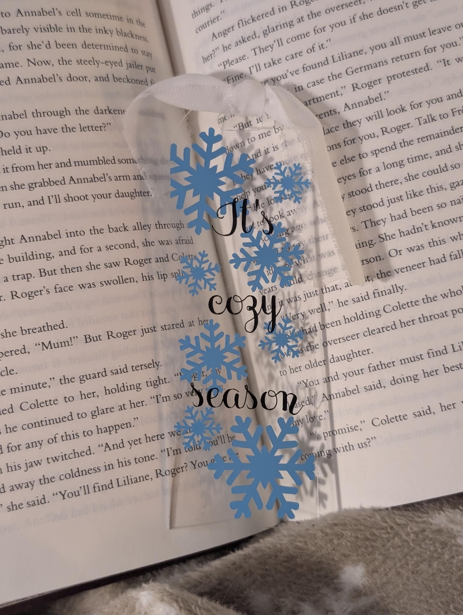 This clear acrylic bookmark features soft blue snowflakes and a flowing white ribbon — a dreamy little reminder that it’s cozy season.