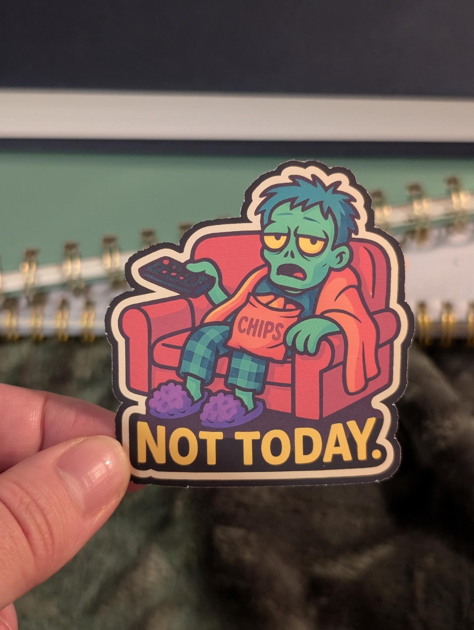 Some days you’re thriving… and some days you’re this guy: wrapped in a blanket, clutching the remote, and surviving entirely on snacks and spite. This “Not Today” zombie is here to honor your proudest procrastination moments. Stick it wherever you need a reminder that sometimes doing nothing is the only correct answer. 🧟♂️✨